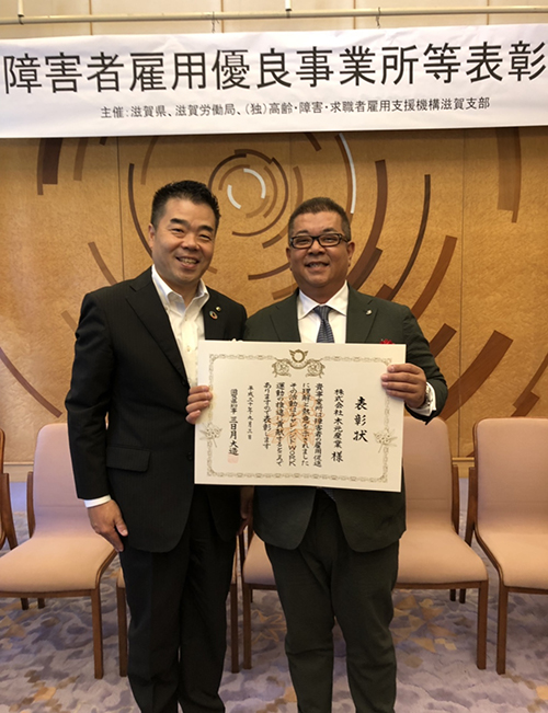 当社はこのほど、毎年9月の障害者雇用支援月間にあわせて実施される「障害者雇用優良事業所等表彰」で、「チャレンジドWORK推進事業所」として滋賀県から表彰を受けました。